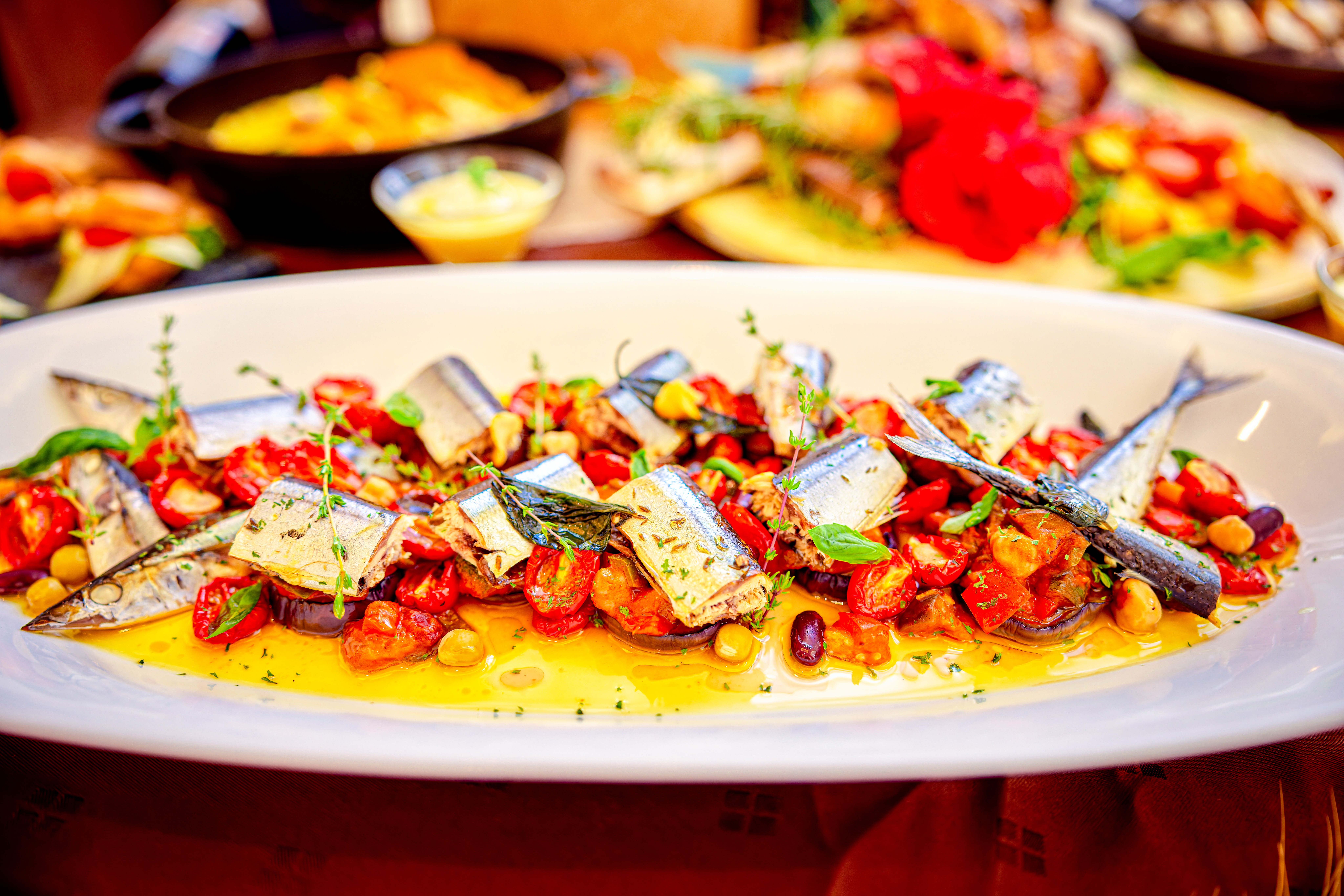 ビストロ ドゥ ラ メールのランチでは、季節の食材を使った沖縄の伝統と創作料理を楽しめます。友人や家族との食事やビジネスランチに最適な、くつろげる空間です。